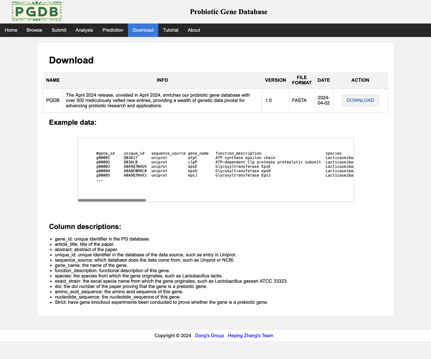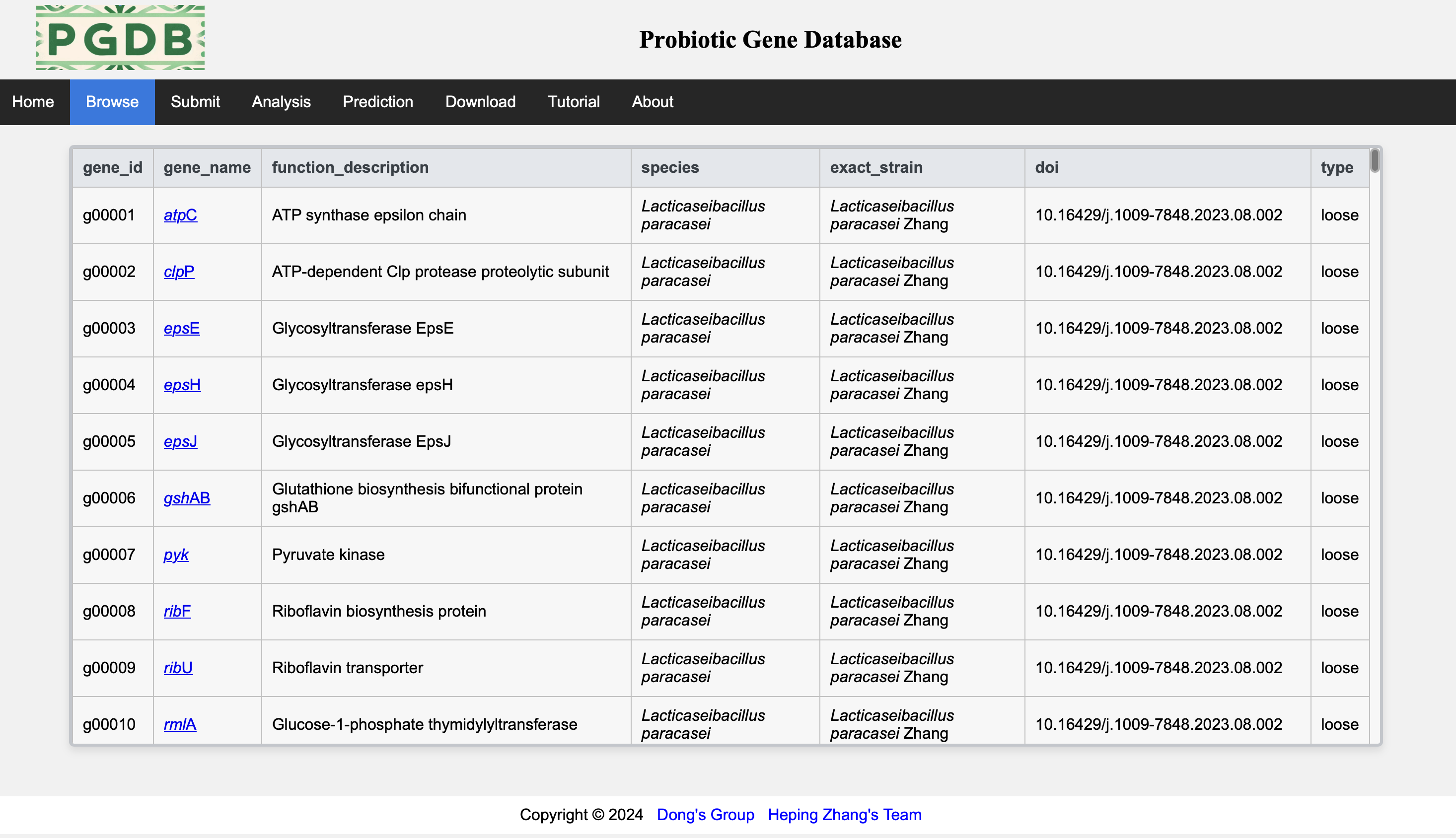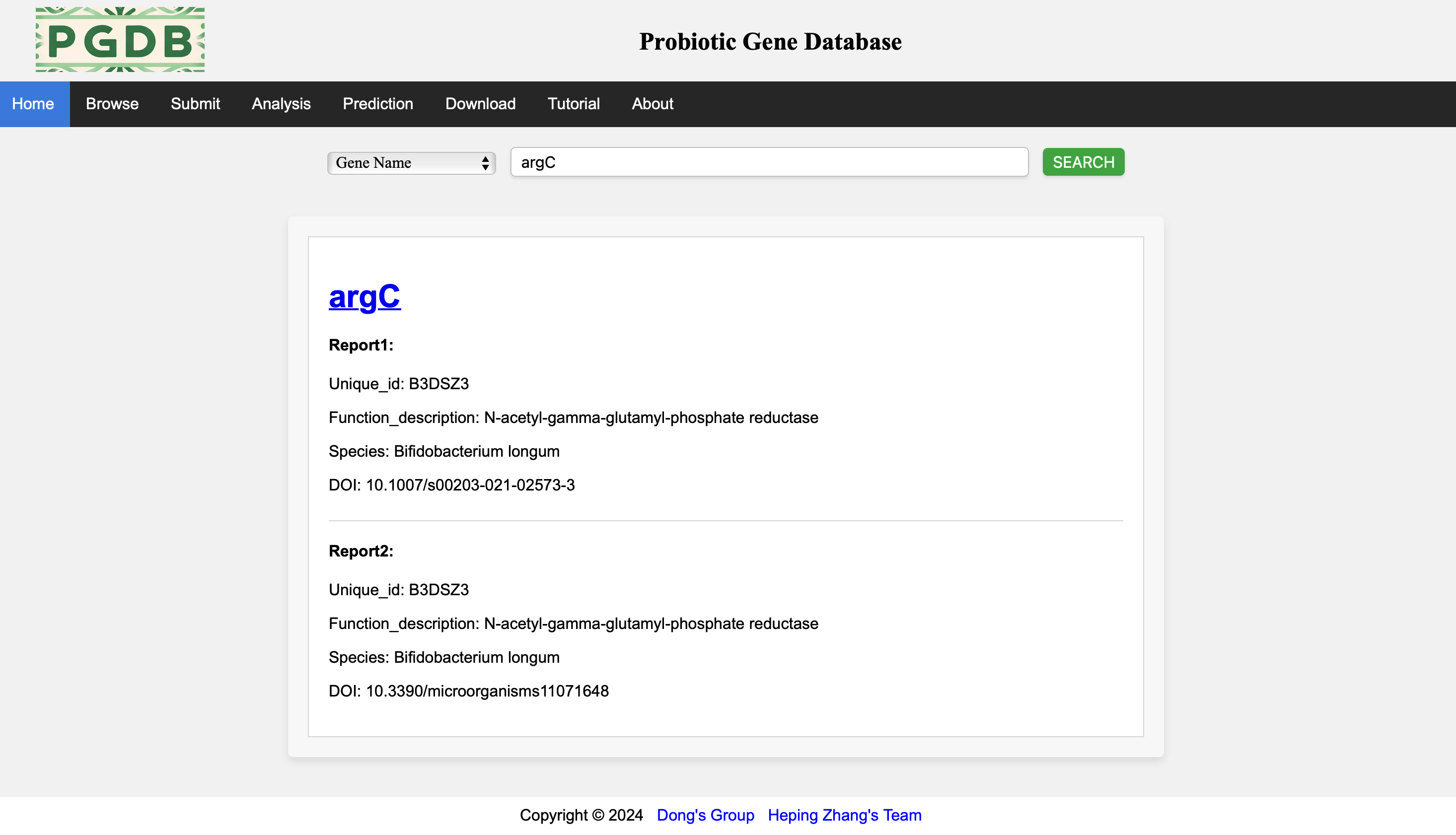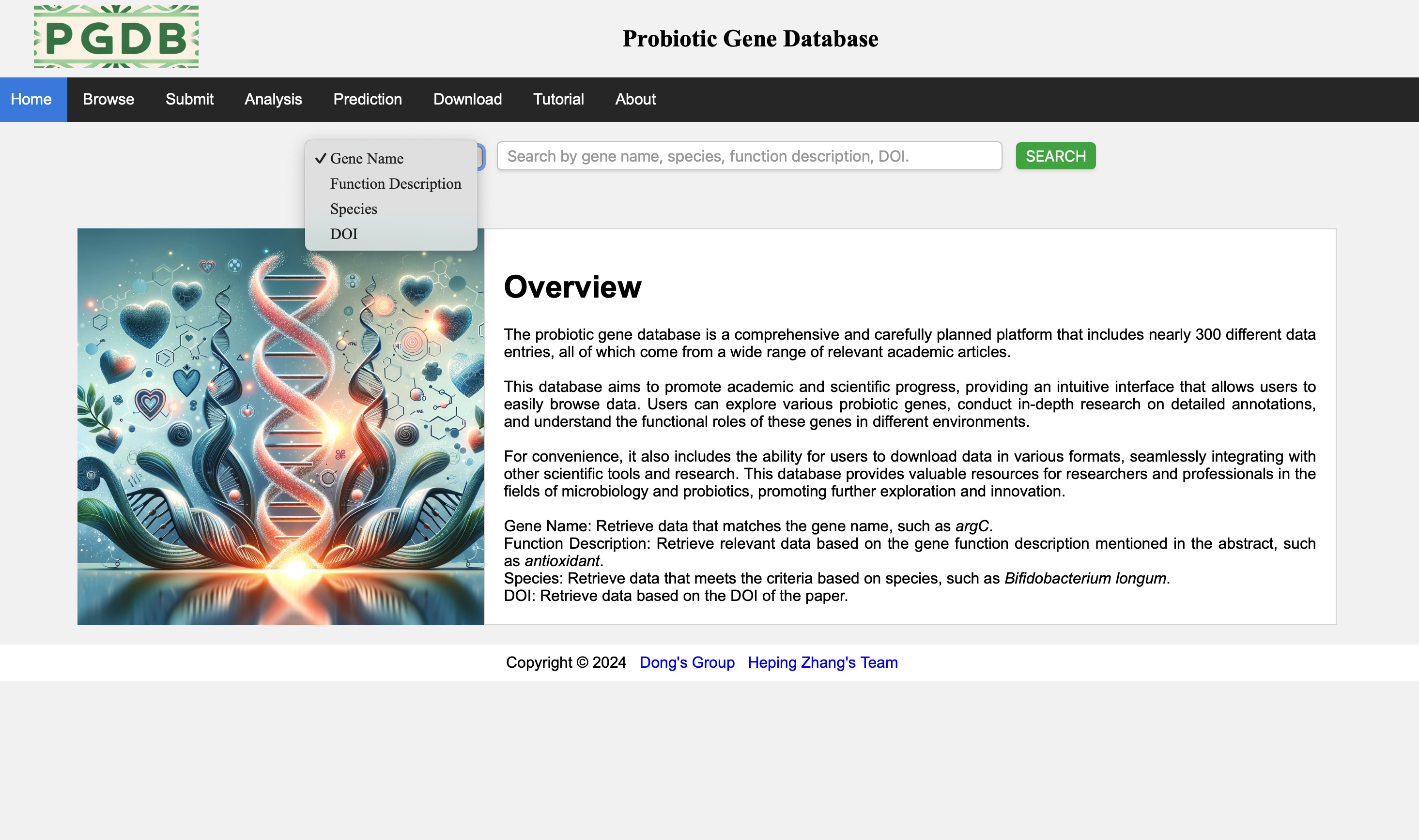 The home page (Figure 1), users can choose to retrieve content based on the drop-down list, search by gene name (e.g. argC), function description (e.g. antagonists), species (e.g. Bifidobacterium longum), DOI.