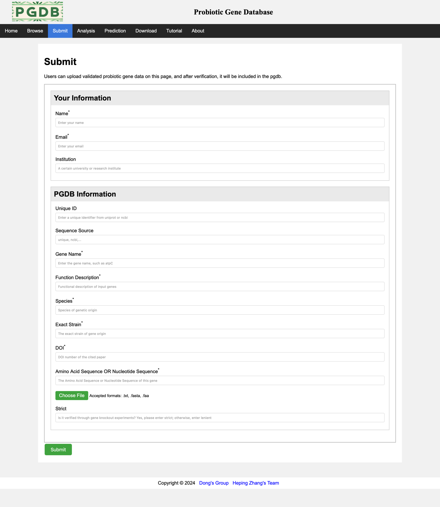 Users can upload certified probiotic gene data on this page (Figure 5), with mandatory fields marked with *.